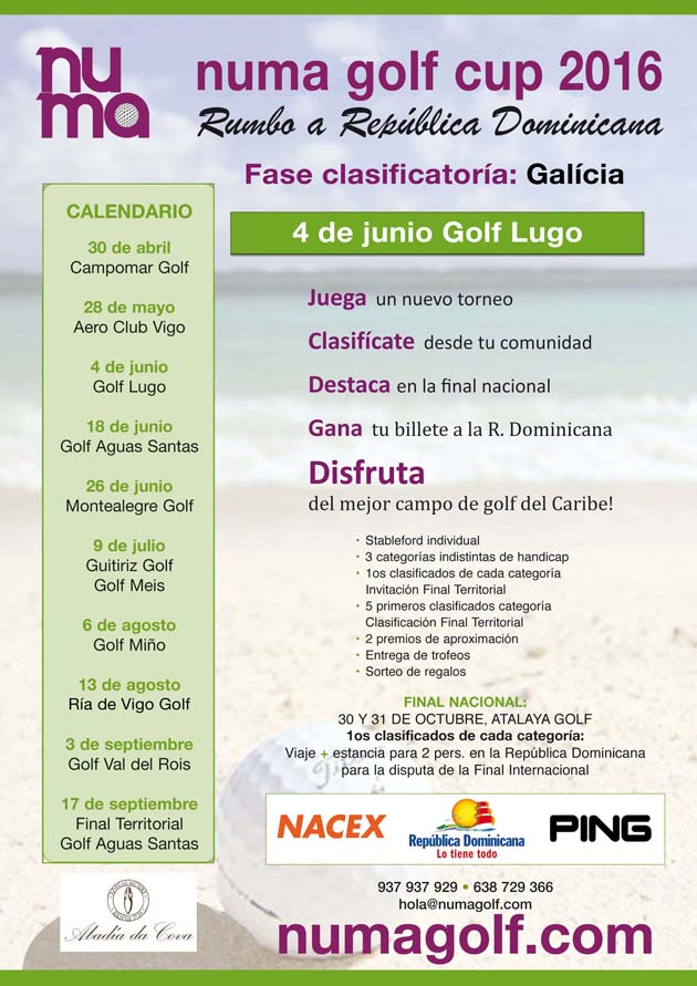 El Club de Golf Lugo acoge este sábado, 4 de junio, la tercera de las nueve pruebas territoriales clasificatorias de la Numa Golf Cup 2016 Rumbo a República Dominicana, que tiene como premio final la posibilidad de disputar la final internacional en el mejor campo de golf del Caribe.