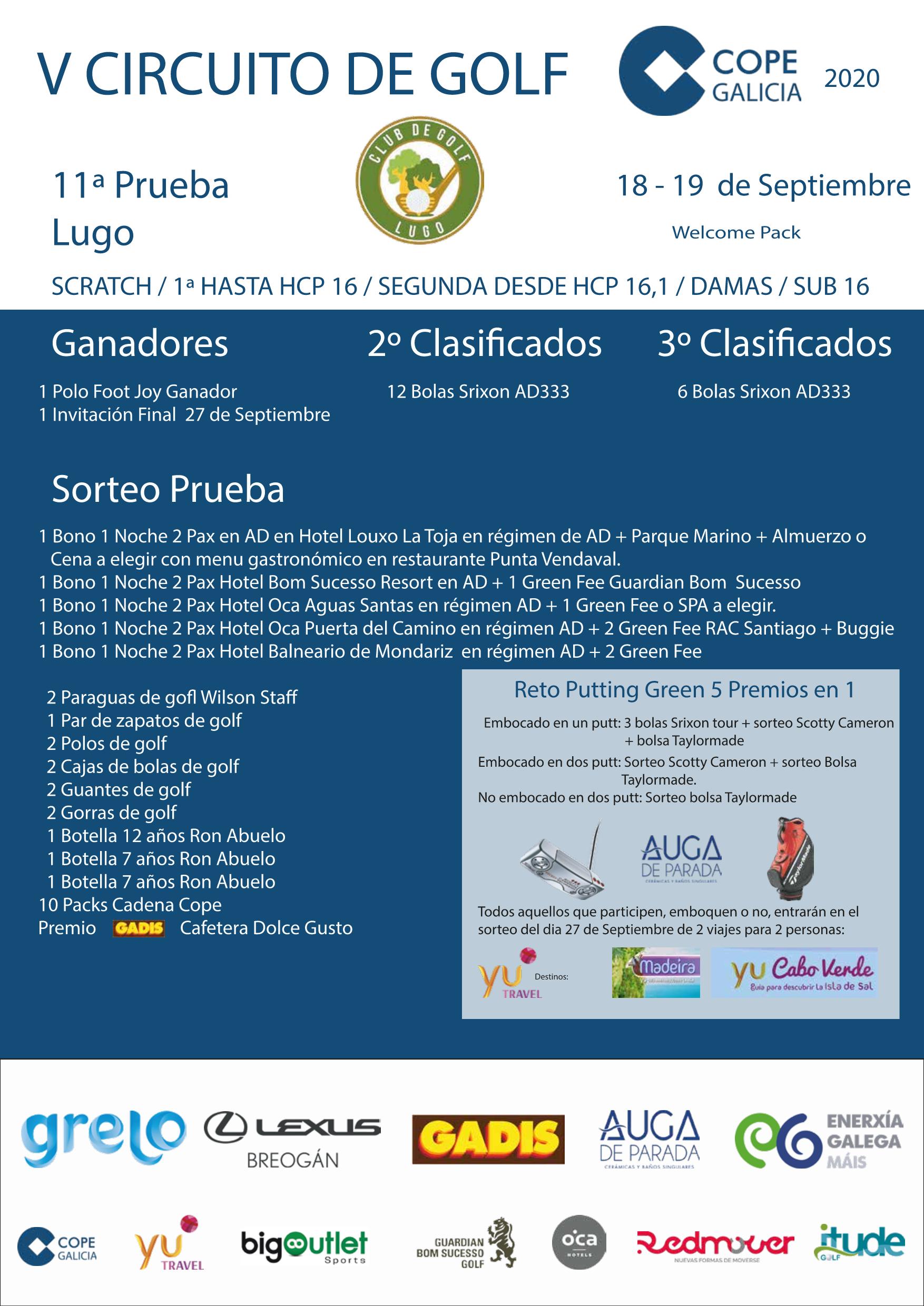 El V Circuito de golf cadena Cope celebrará este fin de semana su 11ª prueba en el Club de Golf Lugo. Todos aquellos jugadores que deseen participar en esta fase previa podrán hacerlo este viernes 18 por la tarde y el sábado 19 a lo largo de todo el día. Se jugará bajo la modalidad stableford individual en un recorrido de 18 hoyos.